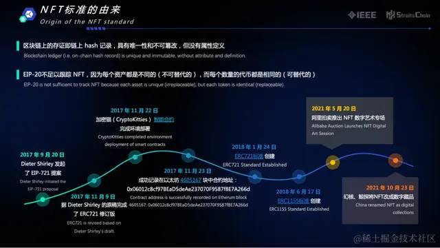 NFT标准是从以太坊技术社区诞生的。2017年9月20日,Dieter Shirley发起了EIP-721提案;2017年11月9日,根据Dieter Shirley的原稿完成了ERC721修订版;2017年11月22日,第一个ERC721标准的智能合约(加密猫智能合约)完成环境部署;2017年11月23日,成功记录在以太坊4605167块中合约地址;2018年1月24日,ERC721标准创建;2018年6月17日ERC1155标准创建;