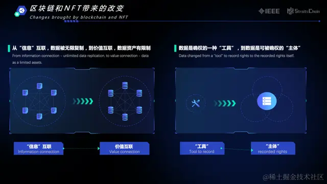 区块链和NFT技术的出现,对互联网产生了巨大的影响。在互联和移动互联网时期,数据是确权的一种“工具”,而随着区块链技术应用,链上数据则是可被确权的“主体”。从信息互联网到价值互联网的转变过程中,数据也从可被无限制地使用到成为资产受到保护和限制,不能在未经授权的情况下使用。而这些都是区块链和NFT带来的改变。