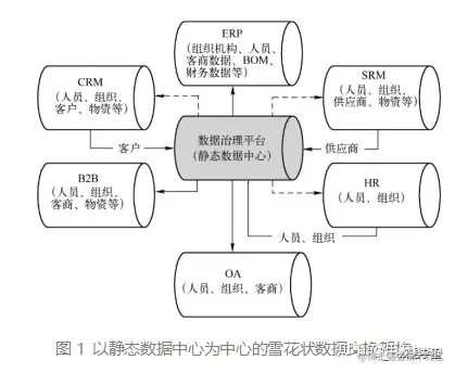经过多年的实践研究发现,基于静态数据中心的数据交换架构,可以实现这一诉求。构建基于静态数据中心的数据治理平台,并以其为中心构建雪花状数据交换架构,如图1所示: