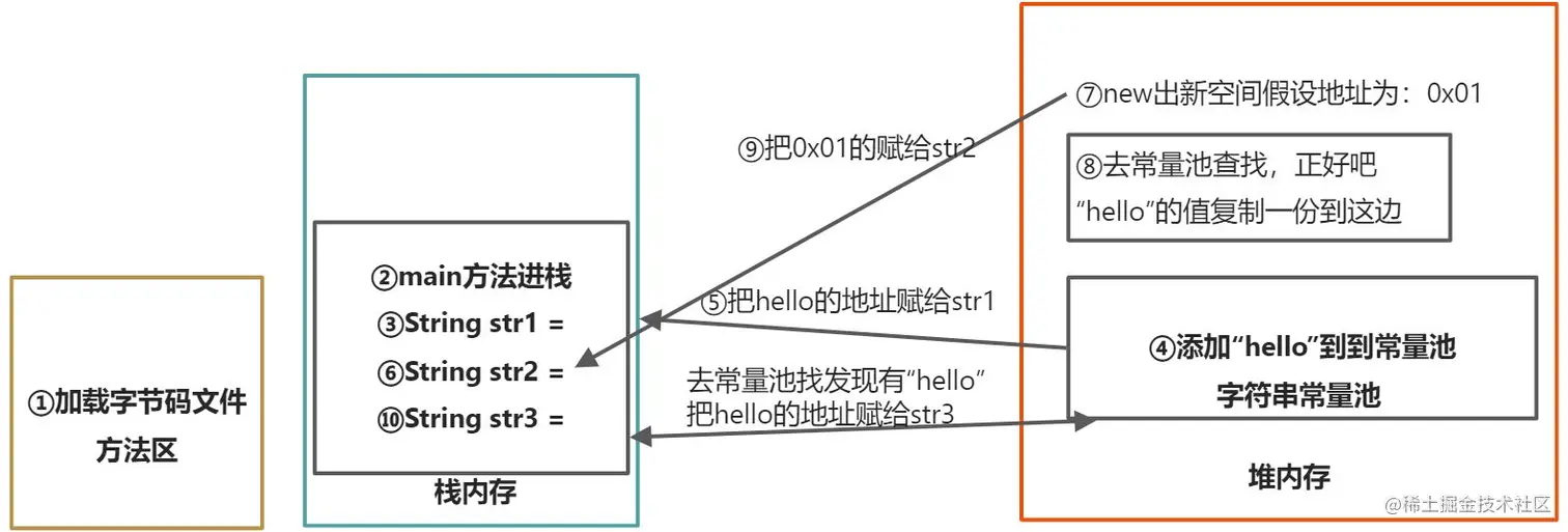 ②用new方法创建字符串对象时,在栈内存开辟变量空间后,再到堆内存new出一块新空间,此时拿参数字符串对象去常量池中复制一份赋值给new出来的空间,再将空间地址赋给字符串变量;