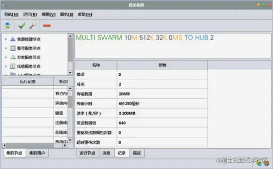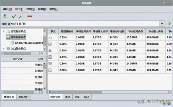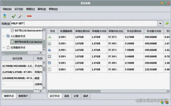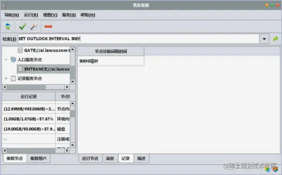 “我的集群”运行过程中,后台会定时检索每个节点的运行状态。这些信息通过右侧的“运行节点”显示出来,包括每个节点的CPU、内存、磁盘使用占比,在线人数、分布式应用软件运行规模等。使用“SET OUTLOOK INTERVAL”命令,可以改变检索间隔时间。比如输入“SET OUTLOOK INTERVAL 30秒”,表示间隔30秒会刷新新一次所有节点记录。最小的检索间隔时间,我的集群规定是10秒钟。