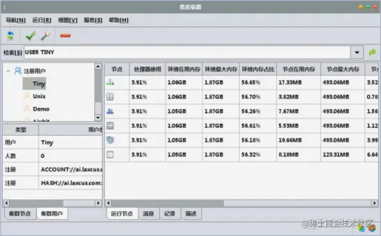 集群用户一栏显示的是用户信息,分为“注册用户”和“在线用户”两种。注册用户表示系统已经通过“CREATE USER”命令,被系统接受登记和获得某些授权。在线用户则是用户在获得授权情况下,登录进入Laxcus计算机集群,处于激活工作状态。