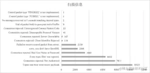 - 解析扫描结果,统计各MQTT服务的状态信息。选择的统计指标为回传信息中可以反应物联网设备情况并且与端口安全性相关的端口开放状态、端口响应返回情况和端口所只用的MQTT服务版本。提取回传报文中的主题及有效载荷信息,并通过文本聚类和报文长度筛选的方法进行识别归类处理。