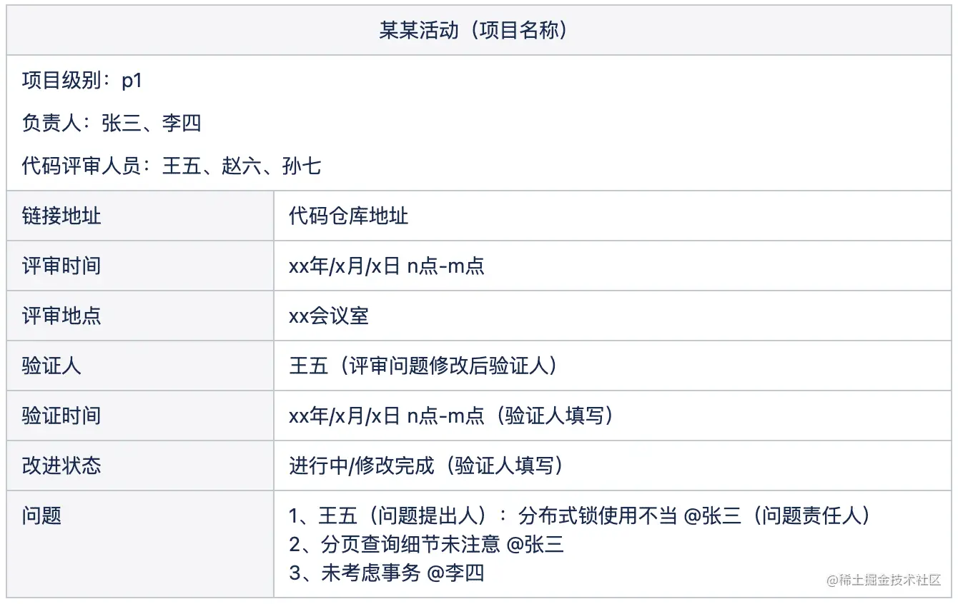 编码规范问题 代码结构问题:重复代码、巨大的方法和类、分层不当、紧耦合 工具、框架使用不当:Spring、redis、mq等 实现问题:错误验证、异常处理、事务划分、线程、性能、安全、实现过于复杂、代码可读性不佳、扩展性不好