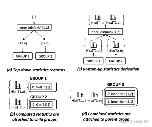 - Statistics Derivation,将所有的逻辑计划,沿着 Tree->Subtree Top-Down 方式进行统计信息搜集。实现中,可以认为是 Tree 的后根遍历,先进行子节点的 Statistics 搜集,再根据子节点提供的 Statistics 搜集自身的 Statistics。