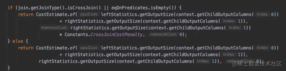 - memoryCost 为右孩子的输出数据大小。做 HashJoin,右表为 Builder 表,占用内存,如果是 crossJoin 会计算对应的 Penalty(此处为10^8L)。