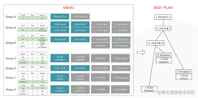 - 不断进行 Cost 计算,通过设置 Cost Limit 收敛进行剪枝,通过 Memo/Group 来记录每种不同的 Required Property 对应的 Best Expr,来更新上文提到的 2 个数据结构,最终到 Best Plan。