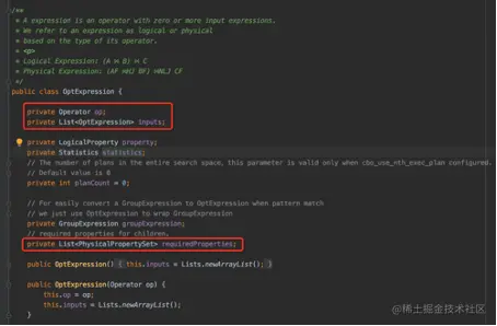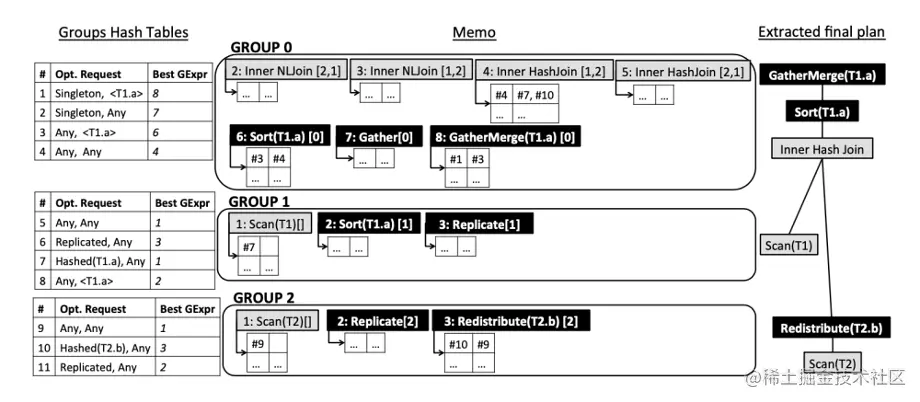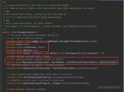 - Map<PhysicalPropertySet, Pair<Double, GroupExpression>> LowestCostExpressions。代表每一个 Group 中,满足 Required Property 条件的最佳 Expression(GroupExpression 可以简单理解为与 Expression 等价)。