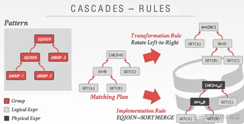 - Stratified search vs unified search,分层搜索是先 Logical->Logical,再 Logical->Physical;统一搜索是 Logical->Logical 以及 Logical->Physical 一起都做了,都属于同一个 Group 中的等价变换。