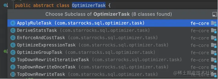- StarRocks 中的 TaskScheduler 基于 Stack 和 OptimizerTask 抽象,实现了一套任务调度框架,Task 的类型有以下几种: