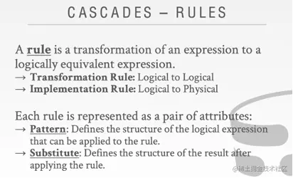 - 本质上是二叉树的转换,利用已知的 Transformation Rule 和已知的 Pattern,对逻辑二叉树做匹配、转换,形成一棵新的二叉树。