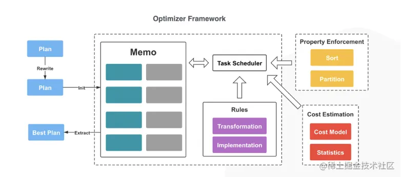 - StarRocks 基本遵循了 Cascades/ORCA 的思想,进行了一部分的改进,这些优化在上文中也有过描述,不再赘述,整体的架构如下。