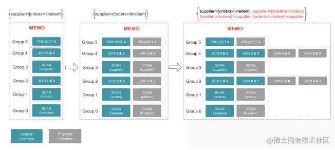 - 同样地,通过 Top-Down 遍历利用 Join 结合律进行 Transformation,由于 Join 结合律生成了新的 Join 组合,所以会新增 Group。