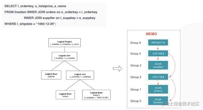 - 利用 Memo 来做 DP Memorization,每一个 Group 记录某一 Required Property 对应的 Best Expr。