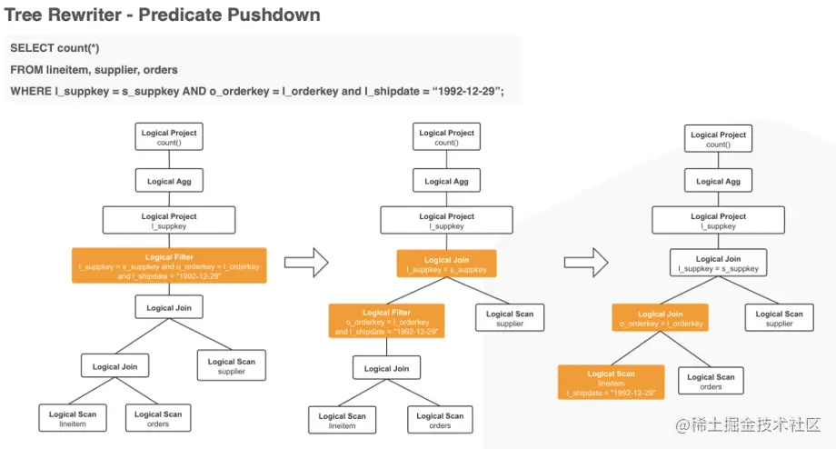 - Rewriter 阶段(RBO)主要是一些 Logical->Logical 的变换操作,基于一些经典的代数变换来进行。