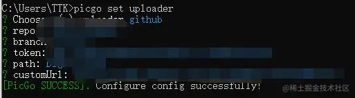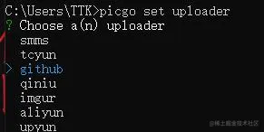 打开cmd,输入命令 picgo set uploader,使用 ↑ ↓ 方向键进行调整,回车键确认,选择GitHub