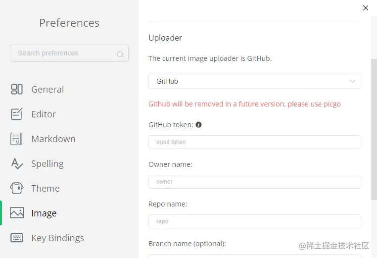 其实一开始我打算直接用GitHub的,但是如下图MarkText建议用picgo,GitHub选项可能会在今后的版本中移除,所以有了上面的PicGo安装配置教程,下面直接选picgo即可,下图选的Github只是给大家看一下,红字