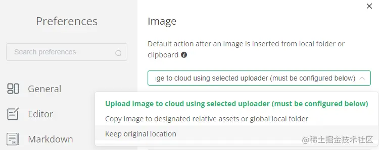 点左上角三条杠,file -> preferences -> General -> Image,选择上传到云端的选项