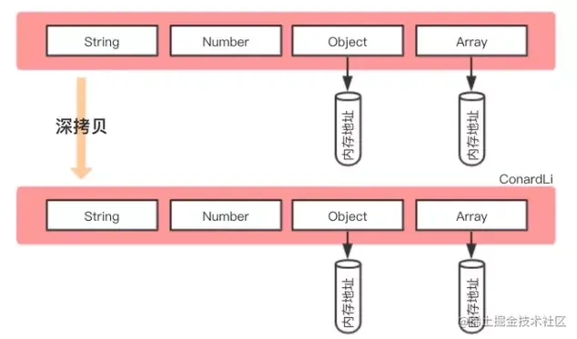 复制对象与被复制对象使用的不是同一个内存地址中的对象,在复制对象复制被复制对象时 js 会在堆中新开辟一个内存地址用来存储复制对象的指针。