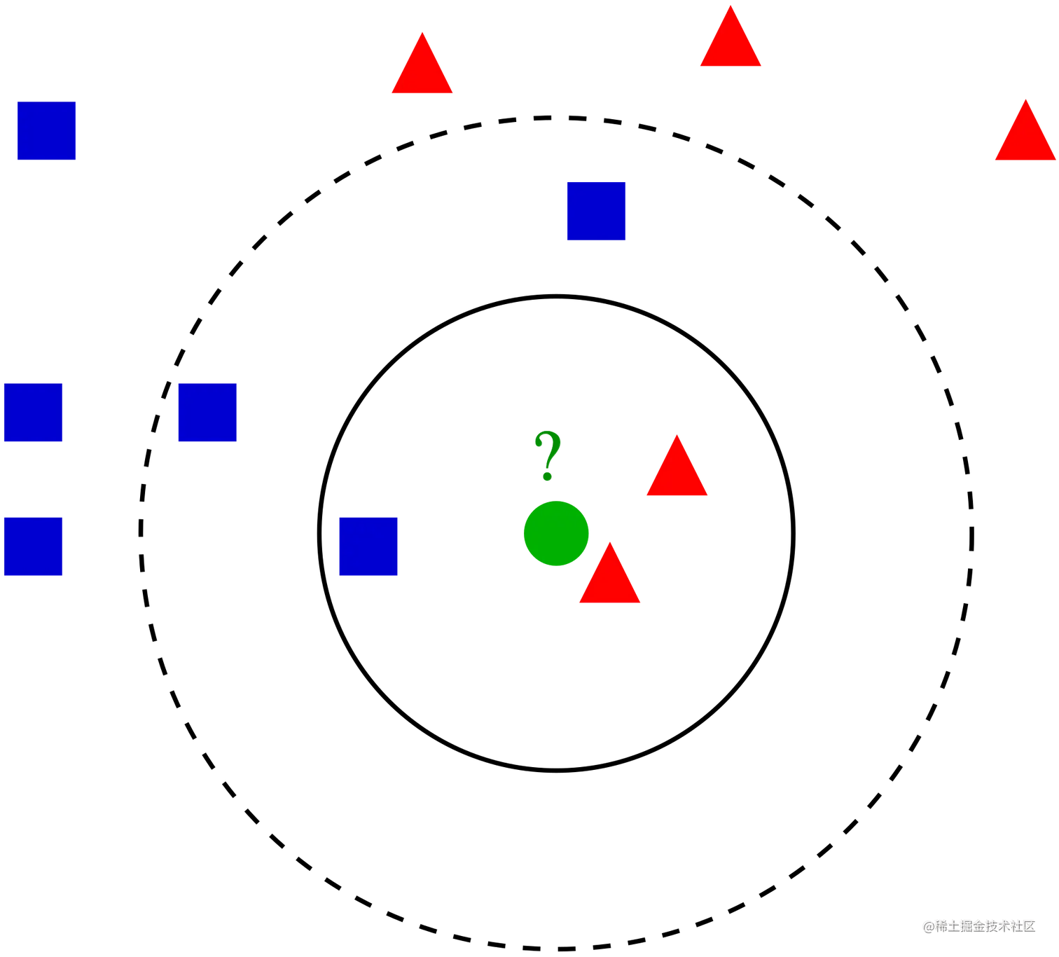 以上面的图为例,如果我们把 K 的值定为 3,那么新数据(绿色)最终的预测结果为红色的三角形,如果 K 为 5,那结果就成了蓝色正方形。在 KNN 算法中,选择 K 的值的过程,其实就是算法参数调优的过程,并没有一个通用的最优的 K 值。