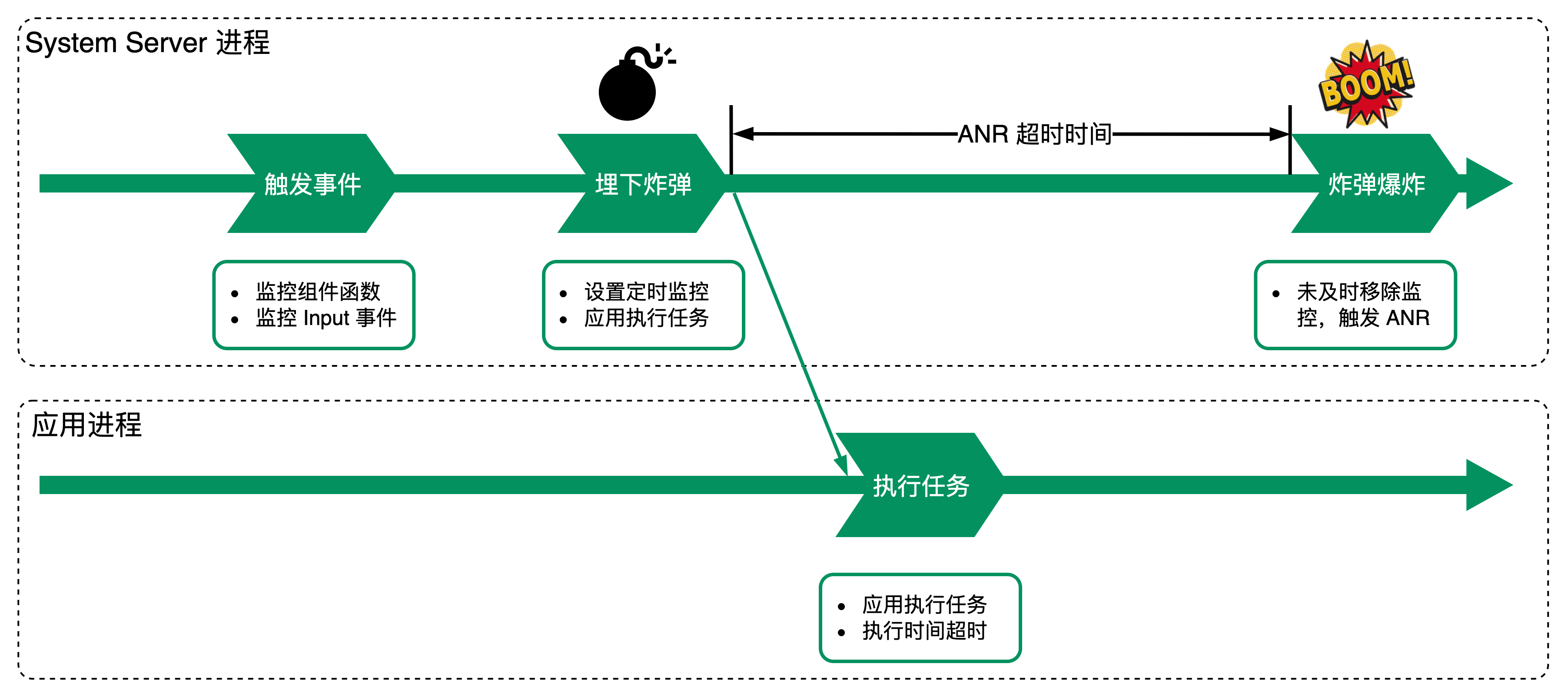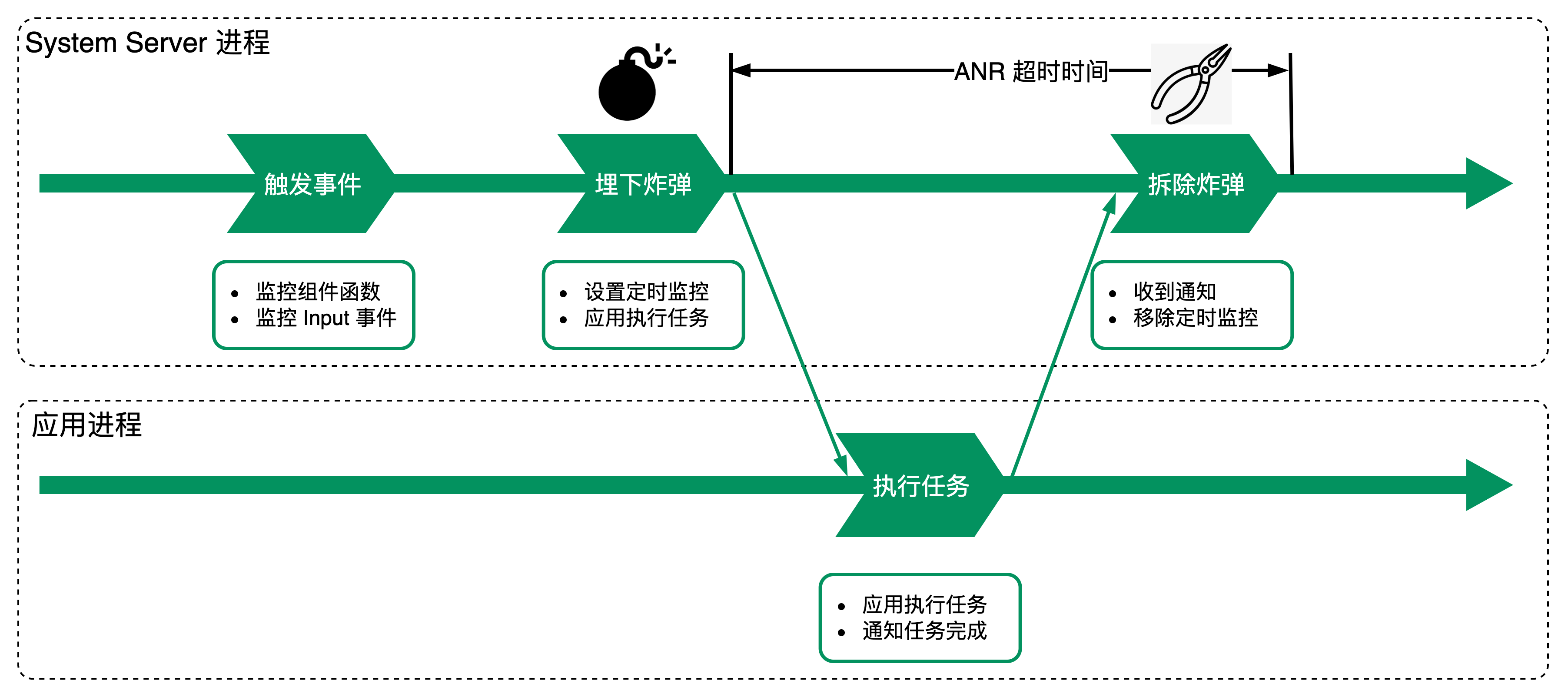 触发 ANR 的过程大致可分为三个步骤: 埋下炸弹 ->执行任务 ->引爆炸弹(或拆除炸弹)