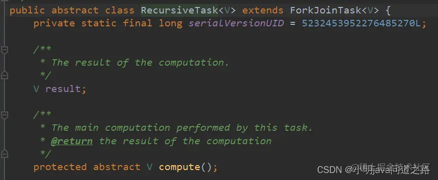 要把任务提交到这个ForkJionPool 线程池,必须创建RecursiveTask的实现类,要定义RecursiveTask只需要实现他的抽象方法compute