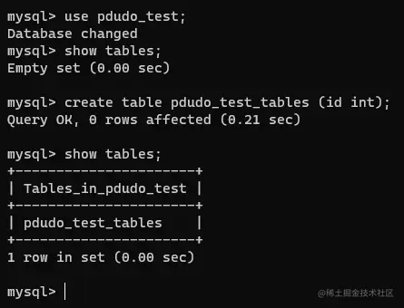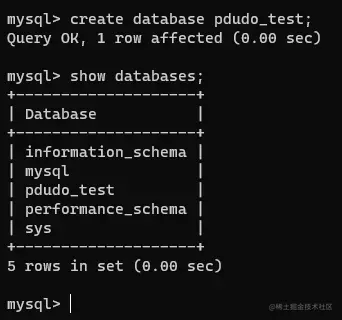 我们在MySQL中可以使用create database 数据库名称用以创建数据库,我们可以尝试一下,创建一个pdudo_test数据库。
