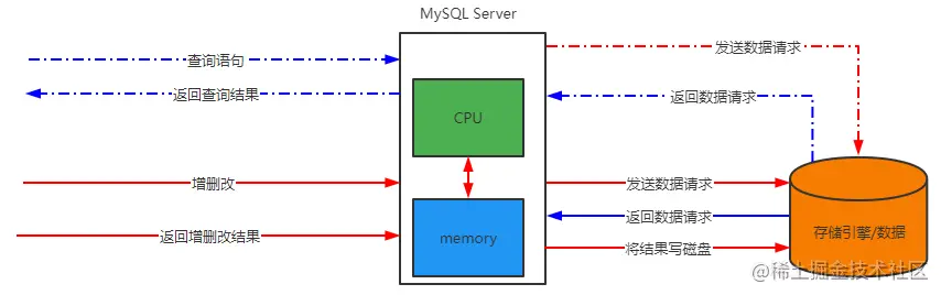 我们学习了众多的存储引擎,例如InnoDB、MyISAM等,这些存储引擎所包含的数据文件,都将数据存储在磁盘中(Memory存储引擎除外),当我们需要读取的时候,会先将磁盘中的数据通过I/O总线,将数据加载到内存中,才能供CPU访问(交由存储引起),在写入的时候,也需要在内存中修改了后(存储引擎),再通过I/O总线写入磁盘。