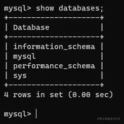 我们在安装完MySQL后,进入后使用show databases;可以看到默认的数据库,我们可以看到已经默认的数据库,例如: