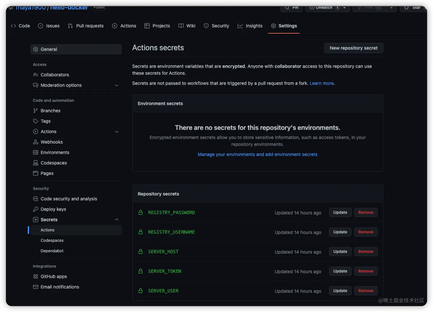 在github上打开项目目录,Settings -> Secrets -> actions,添加好需要用到的参数:
