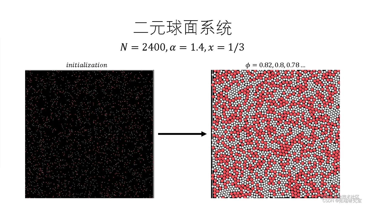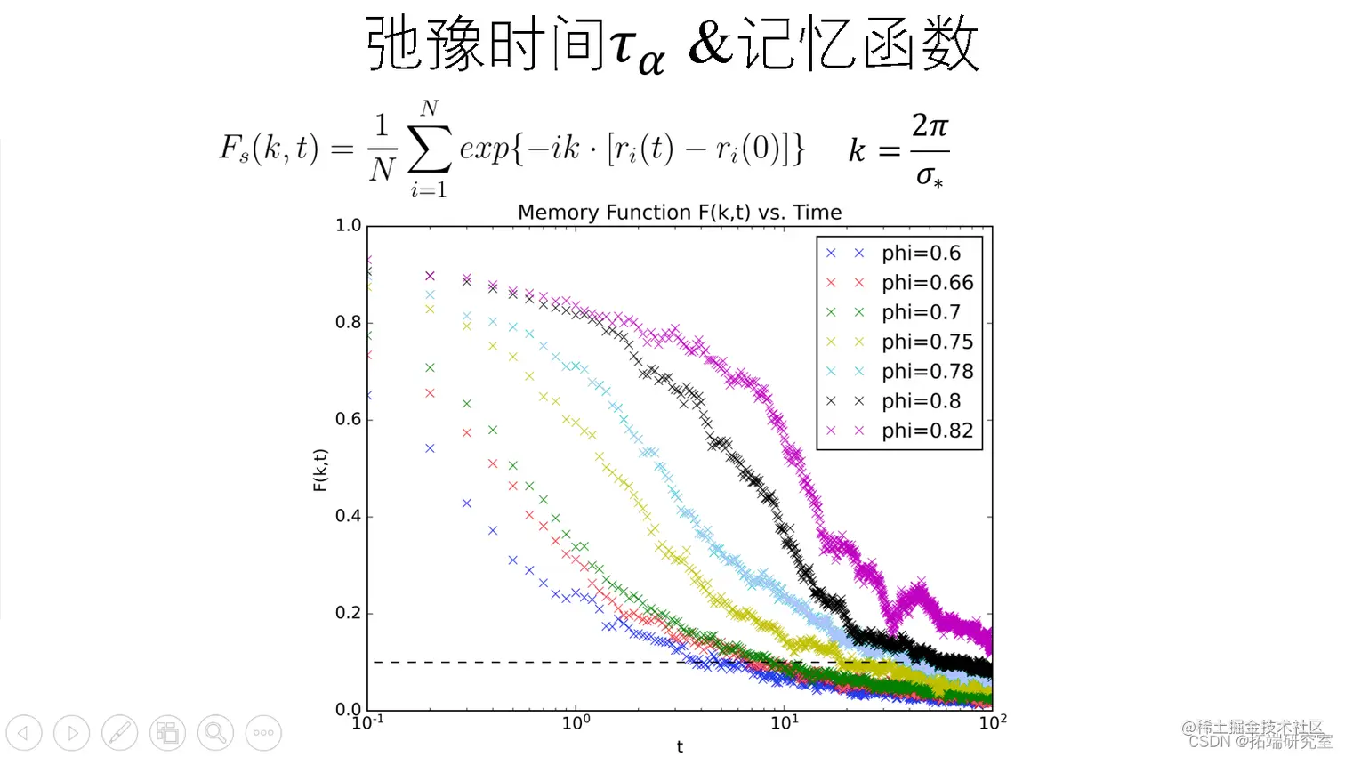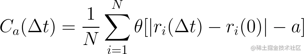 我在Python内搭建如上binary hard disk模型, 并压缩系统至不同的密度来模拟过冷液体。压缩完成之后在此运行系统来模拟过冷液体常规布朗运动。在此期间,收集每一个粒子的实时坐标(x,y)并做如下计算: