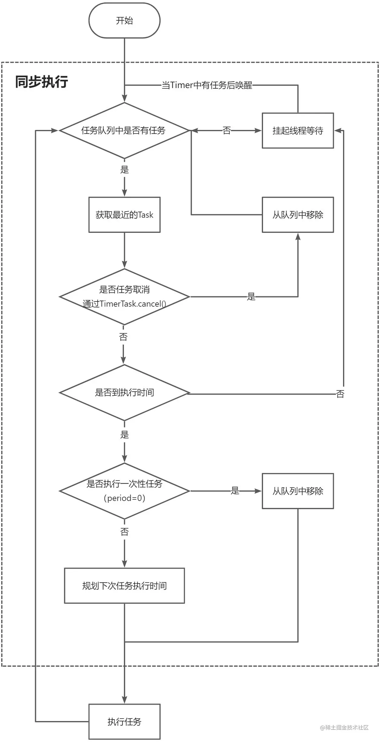 当我们创建Timer类之后,就会启动一个TimerThread执行线程,线程主要执行了一个mainLoop()方法,大致流程如下: