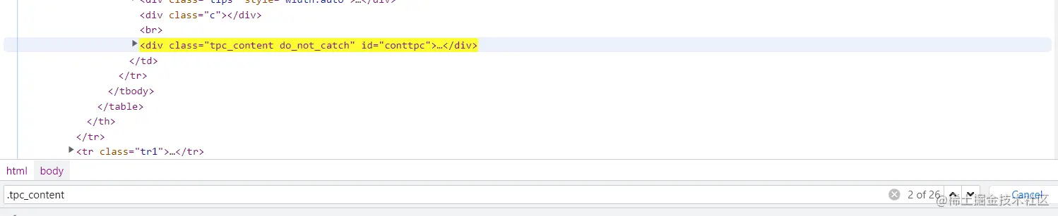 可以看出来,上面的代码先把定义了一个变量保存了我们看到了字符串,然后通过下面的 if 判断的是否启用了去广告插件。下面就是两个延迟任务,第一个任务是 1006 毫秒的,是把元素.tpc_content:eq(0)的内容保存下来并使用上面定义的字符串覆盖掉,第二个延迟任务是 10006 毫秒的,是把上面保存的元素.tpc_content:eq(0)的原本的内容在恢复回来。可以看出来这里的关键就是多次提到的元素,我们去网页里面看看这个元素到底是啥。