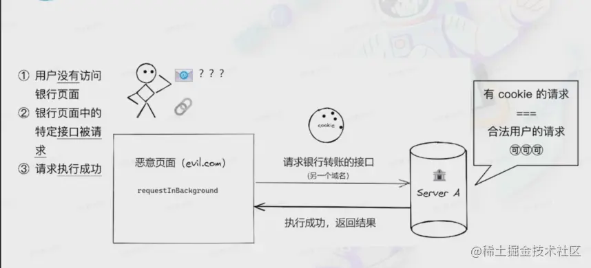 用户收到了一个来自攻击者发送的伪银行链接,接到请求银行的接口,最后请求成功,用户的钱就会被转走。