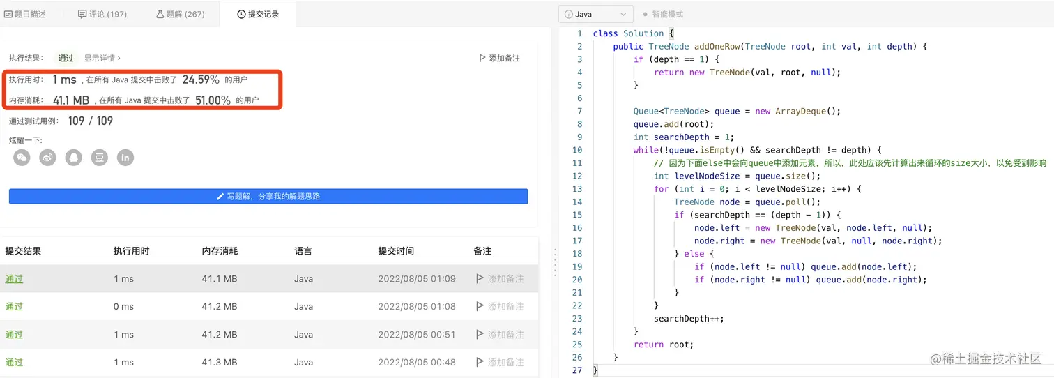 根据题意,我们要在指定的某一层depth中添加一行指定的val值节点,那么很容易想到的解题思路就是广度优先算法。通过广度优先算法+队列,我们可以确定当前所遍历的层数,因为题意是要在depth层中添加一行val节点,其实主要修改节点之间的关系是在depth-1这一层中,所以,当我们遍历到depth-1这层的是,执行新节点的创建并维护到depth-1这层节点即可。