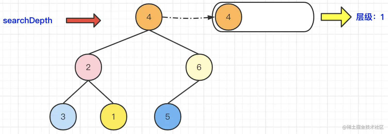 下面我们以root = [4,2,6,3,1,5],val = 1,depth = 3为例。首先,将root节点放入到队列Queue中,此时元素size=1,通过poll()方法遍历每个元素,由于此时层级是1,不满足depth-1,所以不需要创建新节点。具体操作如下所示: