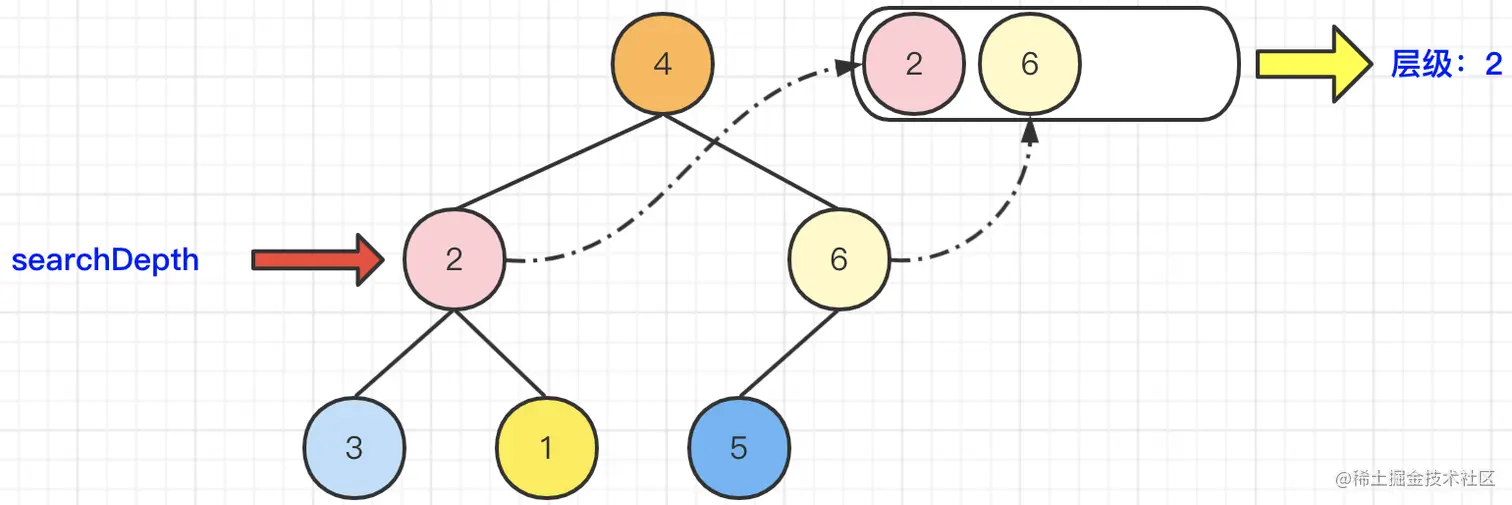 随着我们对Node(4)的遍历,随着我们将其子节点Node(2)和Node(6)也放入到队列Queue中,此时队列 size=2,通过poll()方法遍历每个元素。