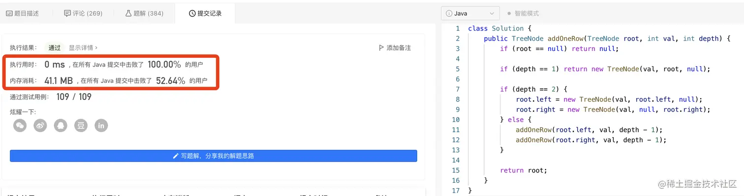 除了可以采用广度优先算法之外,我们也可以采用深度优先算法。那么当深度遍历到达depth-1这层的时候,我们就开始进行新节点的创建。此处与广度优先算法的区别就是,我们不再需要Queue这个队列结构了,而是通过对depth的计算,来确定是否到达了我们要操作的那一层。怎么计算呢?这里面其实会有一些绕。因为深度优先是从root根节点向下遍历的。而入参depth我们获得之后,要通过每次的减1操作,来计算是否满足我们要操作的那一层。他们之间别扭的点就在于,一个是从上往下,另一个是从下往上。那么问题来了,depth要减到什么情况下,才说明到达了我们要操作的那一层呢。其实是这样的:首先我们要操作的那层其实就是depth - 1这层。那么如果从根节点到达这层是需要往下走 (depth) - 1 - 1 = depth - 2 次 ,那么随着每次遍历,depth都会执行减1操作,也就是说,当depth - (depth - 2) = 2的时候,就到达了我们期望要操作的那一层了。即:if (depth == 2) 执行创建新节点的操作。