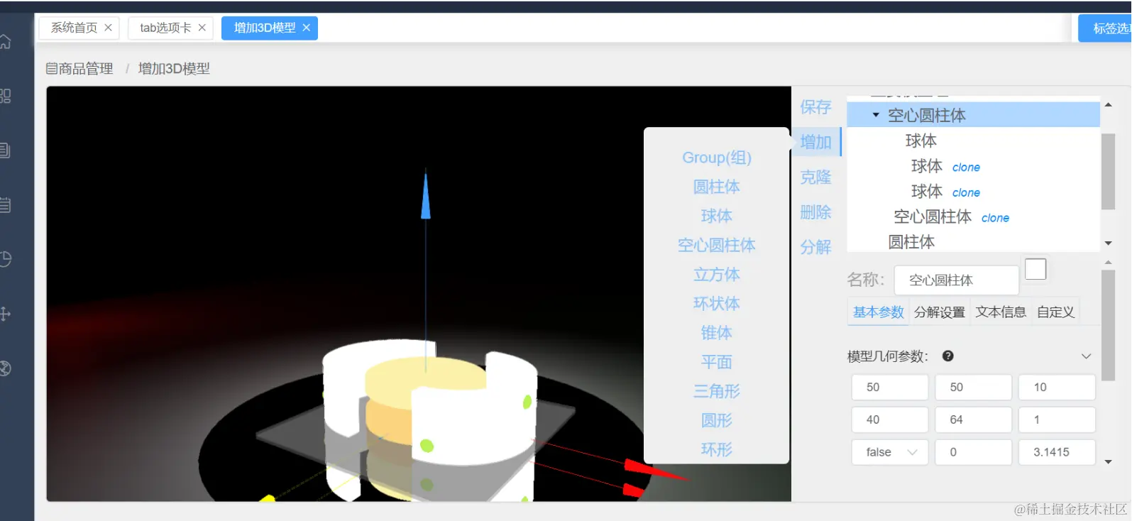 根据蛋糕商品的原型以及相关信息,开始制作蛋糕的3D模型。对于常用的基础模型Threejs已经集成封装好了,但是稍微特殊一点的模型就需要单独去制作。一个3D模型,本质上由无数的点组成,点可以组成线,而三个不在一条直线上的点,就可以组成一个三角形的面,无数的三角形的面就可以通过一定的组合和排列组成各种各样丰富的网络结构或者说网络模型,我们一般称它为Mesh模型。给Mesh模型贴上纹理,就变成了3D模型。以制作空心圆柱体为例,以原点为中心,固定Y轴在ZOX平面通过Math.sin函数画圆,就会形成一圈点,然后再沿着Y轴一层一层叠加,就会构成一个圆柱面,然后减小画圆的半径,形成另一个圆柱面,此时一个空心圆柱的内外壁面就完成了。当然现在还是一圈一圈的散点,然后根据一定规则将每三个点构成一个一个的小三角形,每个小三角形环环相扣,就完成了Mesh模型的创建,然后将内外壁面的边缘的点按照一定的规则链接起来,最后利用片元着色器将三角形填充或者填充上纹理。至此,一个空心圆柱模型就制作完成了。添加到虚拟环境中进行渲染。就能看见一个空心圆柱体。如图下图所示: