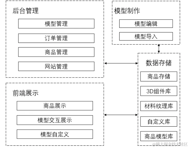 平台整体架构核心如下图所示,其核心主要有四个部分组成,分别是模型制作模块、后台管理模块、数据存储模块和前端展示模块: