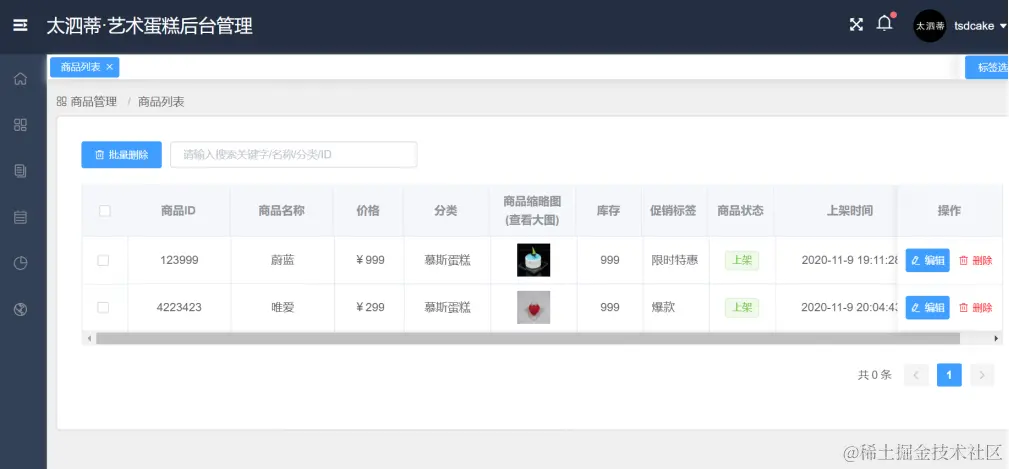 ★ 商品列表:当企业或者商家点击商品列表,那么后台管理系统将会把当前所有的商品信息以表格形式展示出来,便于企业或者商家快捷的对自家的商品集中查看,批量处理。同时也可以点击操作栏对单个商品进行编辑或删除,同时支持多关键字筛选功能,可以输入商品名称、商品的分类,或者商品的唯一ID作为关键字,快速查找想要处理的商品。商品列表效果图如下图所示:
