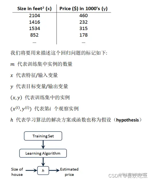 这就是一个监督学习算法的工作方式,我们可以看到这里有我们的训练集里房屋价格。我们把它喂给我们的学习算法,学习算法的工作了,然后输出一个函数,通常表示为小写 ℎ表示。ℎ 代表 hypothesis(假设),ℎ表示一个函数,输入是房屋尺寸大小,就像你朋友想出售的房屋,因此 ℎ 根据输入的 𝑥值来得出 𝑦 值,𝑦 值对应房子的价格 因此,ℎ 是一个从𝑥到 𝑦 的函数映射。