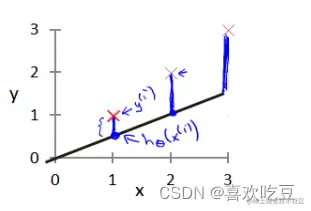 我们选择的参数决定了我们得到的直线相对于我们的训练集的准确程度,模型所预测的值与训练集中实际值之间的差距(下图中蓝线所指)就是建模误差(modeling error)。