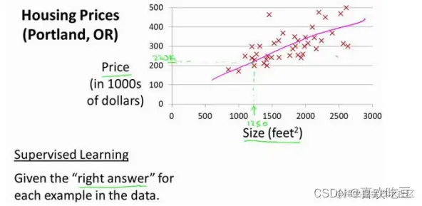这个例子是预测住房价格的,我们要使用一个数据集,数据集包含俄勒冈州波特兰市的住房价格。在这里,我要根据不同房屋尺寸所售出的价格,画出我的数据集。比方说,如果你朋友的房子是 1250 平方尺大小,你要告诉他们这房子能卖多少钱。那么,你可以做的一件事就是构建一个模型,也许是条直线,从这个数据模型上来看,也许你可以告诉你的朋友,他能以大约 220000(美元)左右的价格卖掉这个房子。