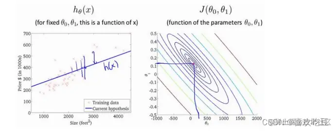 我们的目标便是选择出可以使得建模误差的平方和能够最小的模型参数。 即使得代价