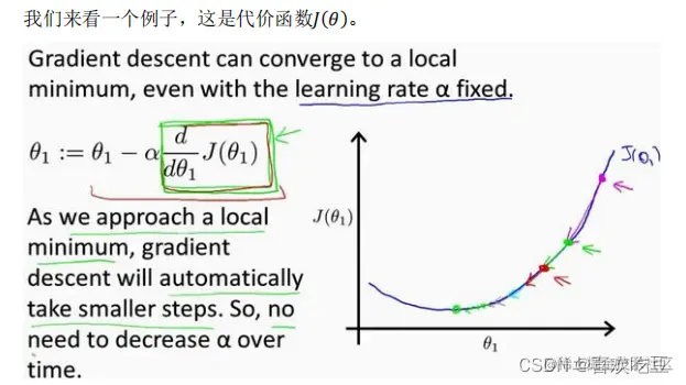 结果是局部最优点的导数将等于零,因为它是那条切线的斜率。这意味着你已经在局部最优点,它使得𝜃1不再改变,也就是新的𝜃1等于原来的𝜃1,因此,如果你的参数已经处于局部最低点,那么梯度下降法更新其实什么都没做,它不会改变参数的值。这也解释了为什么即使学习速率𝑎保持不变时,梯度下降也可以收敛到局部最低点