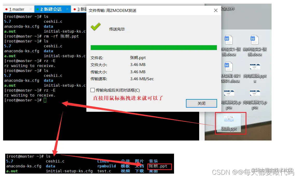 rz是上传,我们直接把windows里的内容通过拖拽的方式就可以传到Linux服务器上: