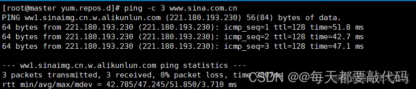 ⭐️既然我们想要在线安装,首先就需要检测网络,利用ping命令,比如:我们去ping百度或者新浪等都是可以的:ping www.baidu.com,ping www.sian.com;如果有网会返回数据包,并一直ping下去,想要停止就ctrl+c结束;当然我们也可以加上-c参数,指定我们ping的次数,如下: