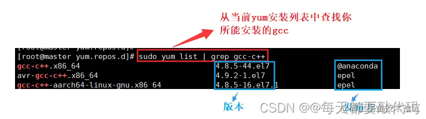 我们要想下载一个软件,首先肯定要在yum列表中查找,安装那个版本?安装那个发布方?比如想安装gcc;我们就要在yum list(yum列表中)去查找: