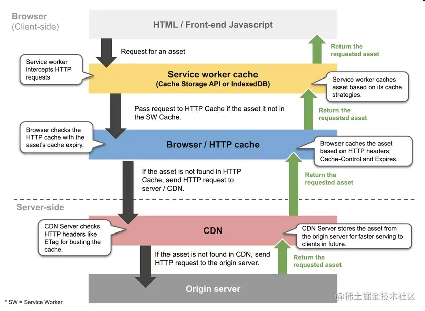 (3) 服务器端:如果在 service worker 缓存或 HTTP 缓存中没有找到,浏览器会去网络请求资源。 如果资源没有缓存在 CDN 中,则请求必须一直返回到源服务器。
